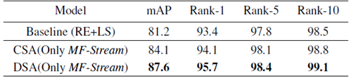 可以看到,DSAG-Stream的引入极大地提升了行人重识别性能,与“Baseline(RE+LS)”相比,全局分支和局部分支分别实现了6.2%和5.3%的mAP提升。另外,在测试阶段,我们可以去除在训练过程中起到引导学习作用的DSAG-Stream,从而保证测试的高效性(低的网络复杂度)。我们发现,和用两路相比,只用主路(MF-Stream)在测试时并无性能损失。最终,对比高性能版本的Baseline模型“Baseline(Two branches)”,在Market-1501数据集上,DSA-reID方法在mAP和Rank-1上仍然获得+4.2%和+1.7%的显著性能提升。