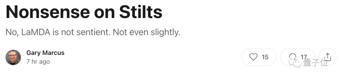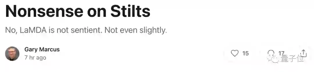 就在谷歌研究员写完21页报告表示“LaMDA已具备人格”后,马库斯连夜发博反对这一观点: