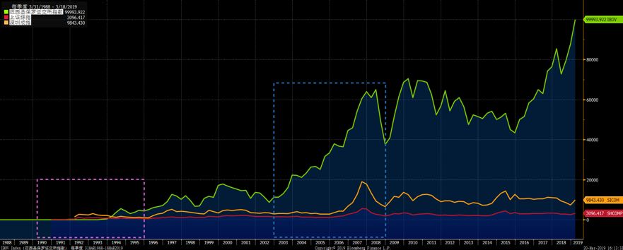 1988-2019巴西股指(绿)、上证综指(红)、深圳成指(橙)历史走势