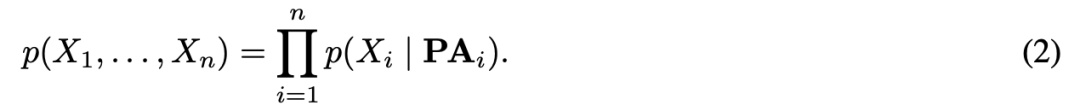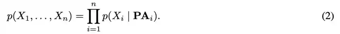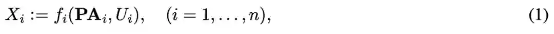该公式使用确定性函数 f_i,该函数依赖于 X_i 在图中的父亲 PA_i 和随机未解释变量 U_i。图中的有向边表示直接因果关系,因为父亲通过有向边与 X_i 相连,并通过公式 (1) 直接影响 X_i 的任务。噪声 U_i 确保整体目标 (1) 表示通用条件分布 p(X_i |PA_i),噪声集合 U_1, . . . , U_n 是联合独立的。如果它们不是这样,则根据共同原因原理,应存在另一个变量引起它们的相关性,因而该模型不具备充足的因果关系。