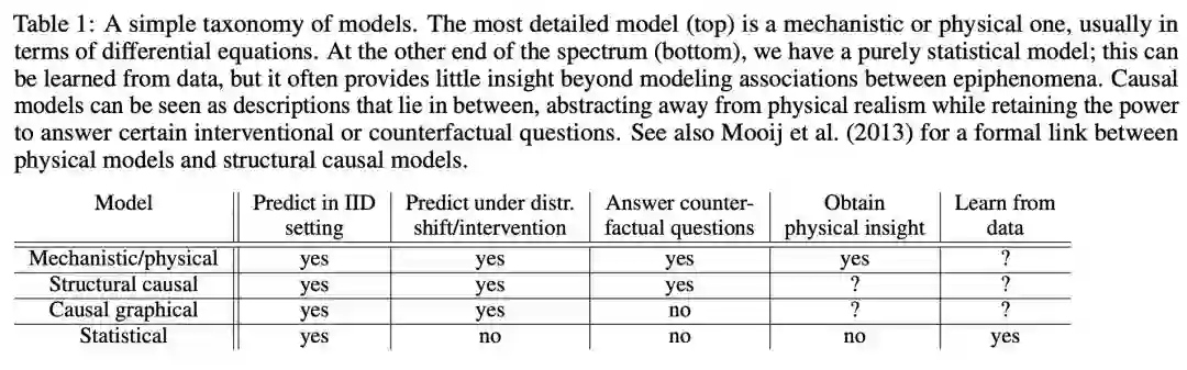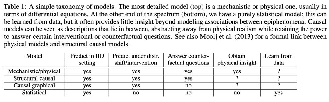 而另一个极端(最后一行)是纯统计模型,它可从数据中学得,但无法对建模副现象(epiphenomenon)之间关联以外的事情提供见解。