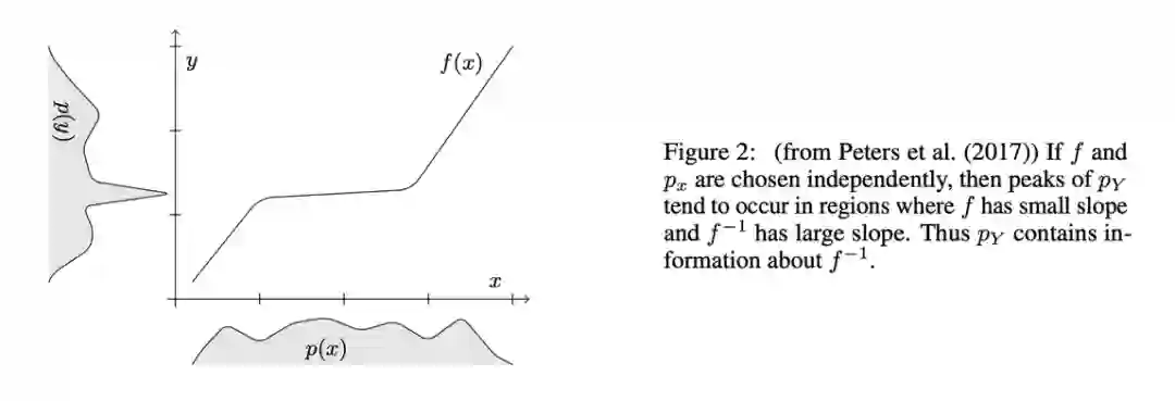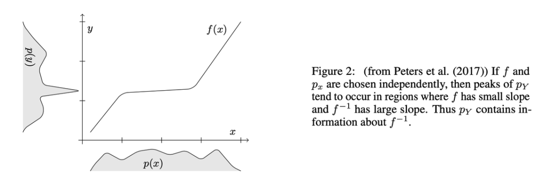 图 2:如果 f 和 p_x 是独立的,则 p_Y 的峰值可能出现在 f 斜率较小、f^−1 斜率较大的区域。因而 p_Y 包含 f^−1 的信息。