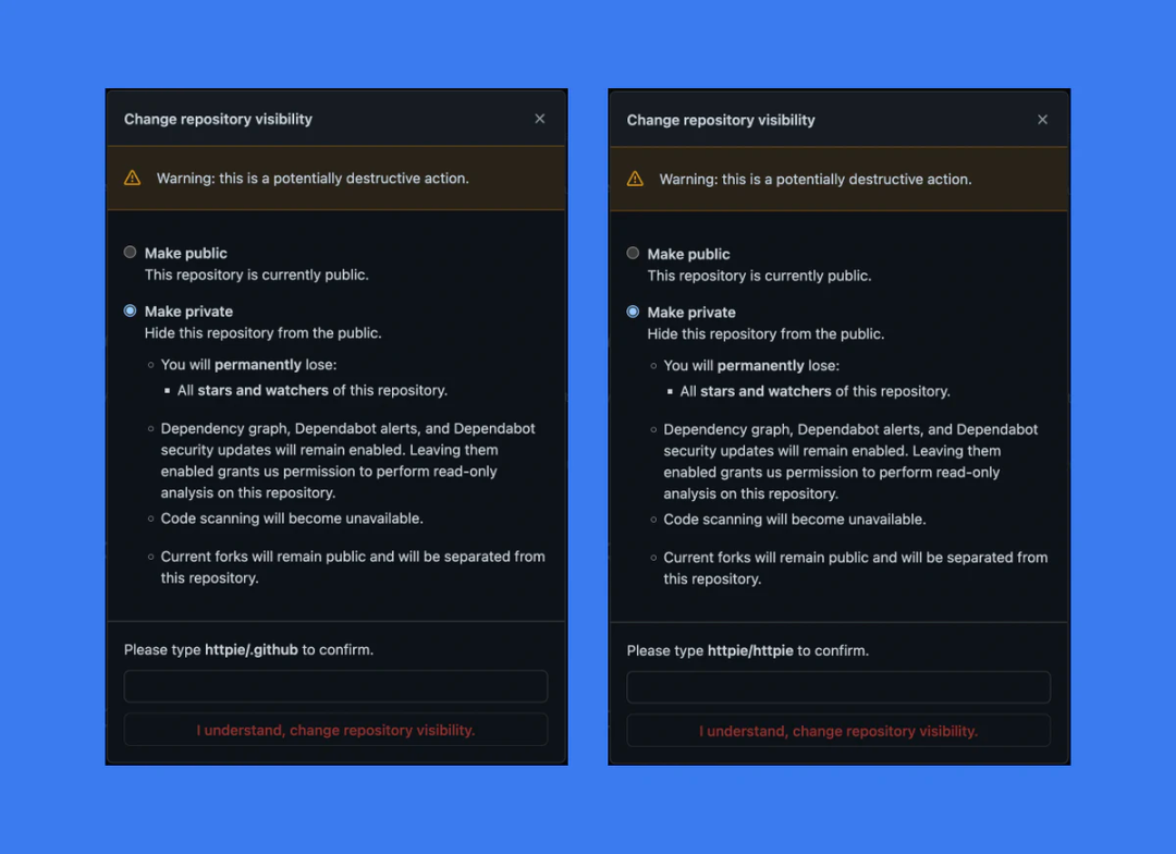 对于这起乌龙事件,Jakub 解释道,他其实知道将代码仓库设置为私有,就会永久删除所有关注者和星级,显然他也无意将 HTTPie 私有化。情况是他在事情发生一周之前创建了一个新的仓库,当他在操作隐藏项目简介时混淆了新的仓库与原来的 HTTPie 项目,从而不小心将 HTTPie 项目私有化,导致项目星星消失。