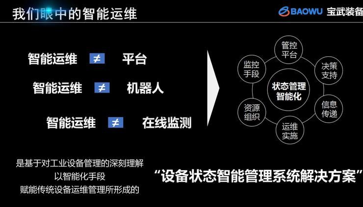 智能运维是基于对工业设备管理的深刻理解,以智能化手段赋能传统设备运维管理所形成的“设备状态智能管理系统解决方案”。它的核心是基于设备状态变化趋势的智能决策,将这种决策映射到整个设备管理活动当中,基于对设备当前状态把握和未来状态预知的基础上,去判断设备该不该修,什么时候修,修什么,怎么来修,谁来修,也就是完整地体现数据驱动决策;在整个设备管理中,“从数据中来,到数据中去”。