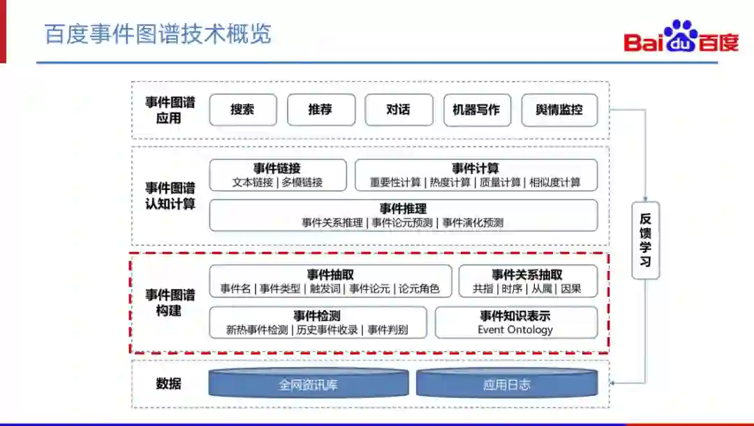 这是百度事件图谱的技术概览图,主要分成四个层次:数据层、构建层、认知层和应用层。本次分享的重点是事件图谱的构建层技术。
