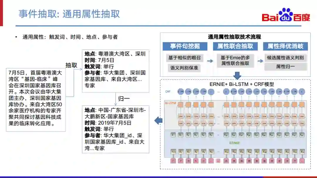 通用属性抽取的目的是抽取触发词、时间,地点、参与者等通用的事件角色。由于技术是比较通用的,我们采取的是一个多属性联合抽取的模型。这里的ERNIE是百度提出的一个预训练语言模型,在这基础上再加上Bi-LSTM+CRF,同时抽取多个属性。如图所示,该流程是先进行一次事件句的识别,找到关于某个事件的句子。然后,再对这个句子进行多属性联合抽取,并对抽取的结果进行归一。地点归一到国家、省市区县等,时间进行规范化、参与者实体化等等。