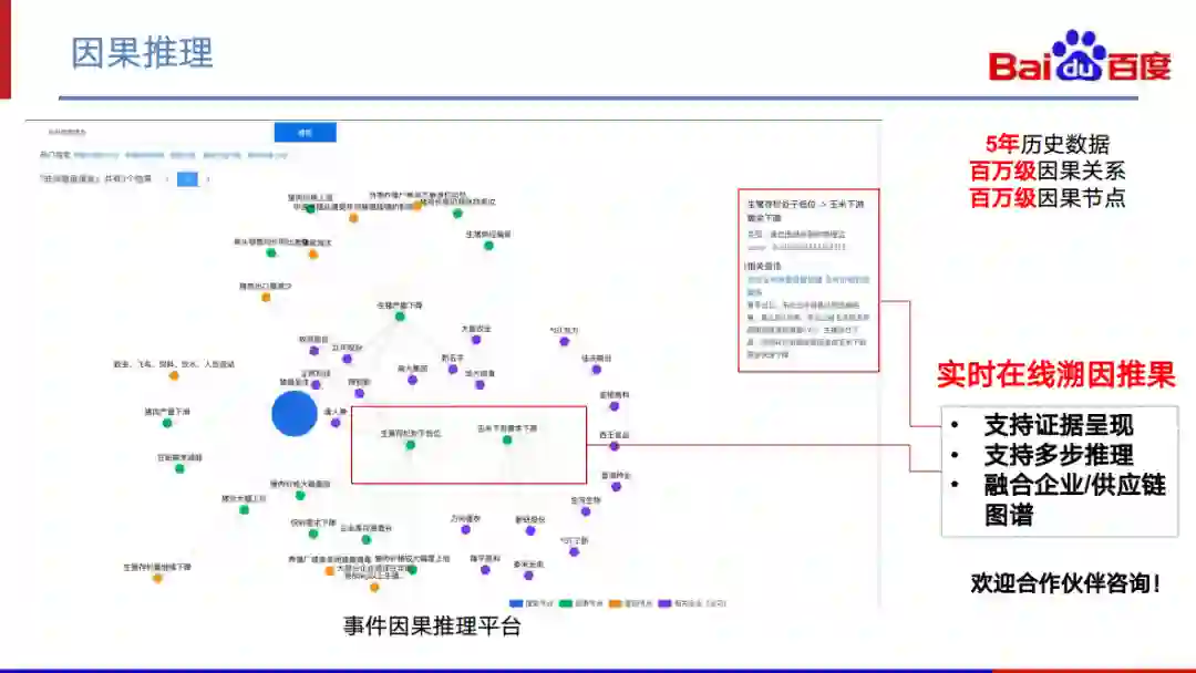 最后一块是因果推理。目前,我们在金融领域做了一些因果推理的尝试。我们将5年历史数据的相关因果进行挖掘和提取,构成了一个因果图谱。该图谱目前的规模接近两百万节点与关系。我们能够进行在线、实时的溯因推理。支持推理的证据呈现,也支持多步推理。同时还可以融合企业与供应链图谱,进行上下游事件推理。以 “非洲猪瘟爆发”为例,该事件爆发会导致 “生猪存栏处于低位”,同时也会导致下游“玉米需求”下降,最终影响到与“玉米”行业相关的公司。目前在这个方向上,我们还处于探索阶段,非常欢迎金融圈感兴趣的朋友们跟我们一起合作&探讨。