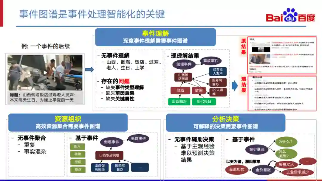 事件理解:以“山西饭店倒塌事件”为例,如果没有事件图谱,我们只能得到与这个单独的事件相关的内容。而通过事件图谱,我们还能得到它的一些后续事件,如“国务院督办”等。基于这样一种事件级别的理解,我们就可以把原来只是聚焦于一个单一事件的内容升级为对事件的上下文、前因后果都能联系起来的一种事件脉络的呈现,从而大大提升用户获取事件信息的效率。