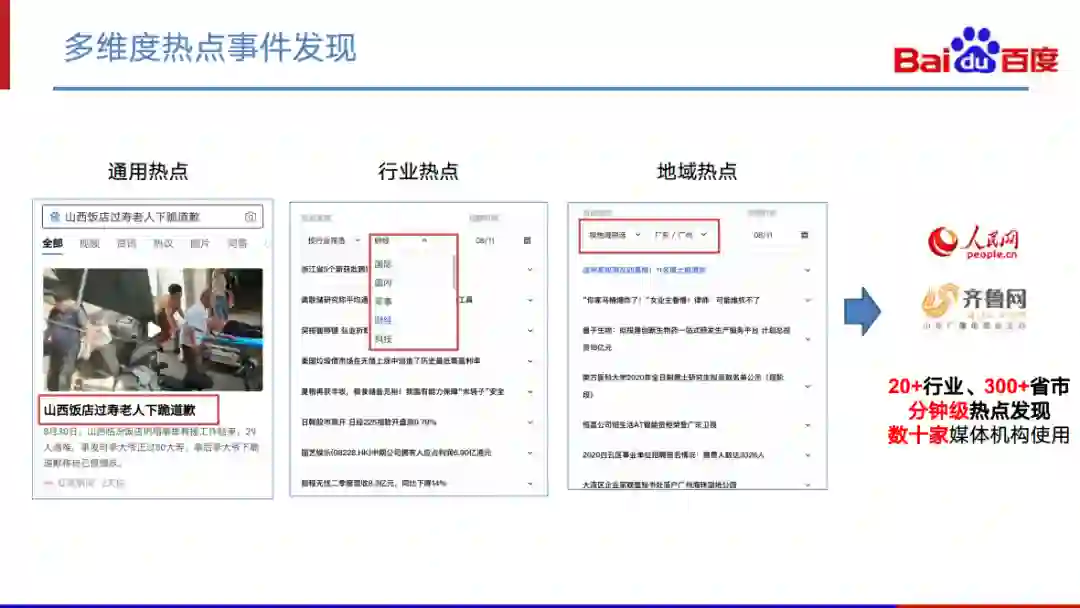 在热点发现这一块,我们能够做到分钟级的热点发现。对于行业热点、地域热点等中长尾事件也可以做到分钟级的发现,因此我们可以支持很多对中长尾、小事件敏感的应用场景。目前我们的事件检测已能够支持二十多个行业、三百多个省市的分钟级的热点发现,并在人民网,齐鲁网等数十家媒介机构中落地。