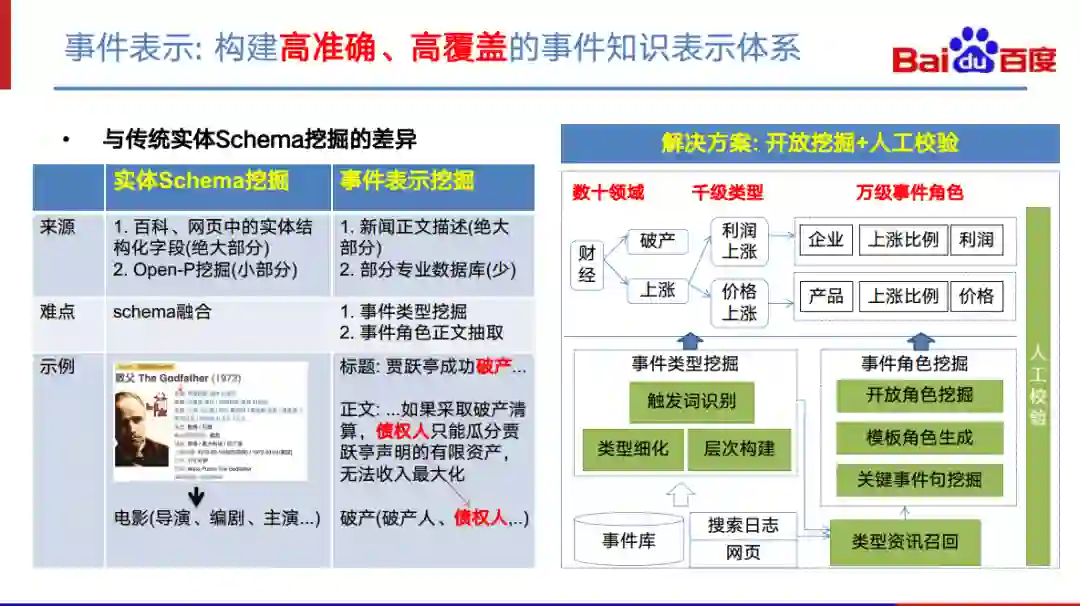 因此,我们必须从正文中去挖掘事件类型的属性。比如,“破产”这个事件类型。从类型名可以知道该事件可能会有一个“破产人”属性,但是“债权人”这个属性就必须从该类型相关的正文中才能找到。目前的解决方案是开放挖掘+人工校验。具体来说分成下面几个部分。首先是开放类型挖掘,基于事件检测得到的事件库、日志等数据,我们挖掘出事件对应的类型并进行层次构建。在得到这样一个事件类型体系之后,我们会针对事件类型进行相关资讯召回,再进行每个类型的角色挖掘。最后再进行人工校验。通过这种方式,我们在几十个领域中得到几千个事件类型,以及一万多的事件角色。