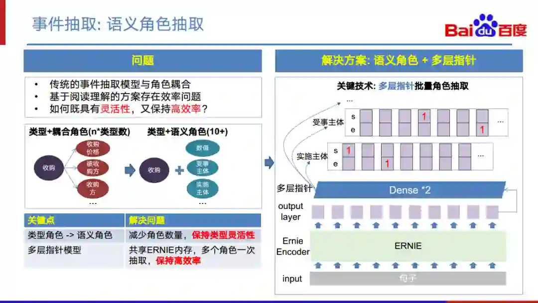 从左边中间这幅图我们可以看到常见的事件类型跟它的角色是存在一定的关联关系的,但实际上也可以把它们解耦成一个类型和一系列的语义角色的。例如,“收购”类型和角色“收购价格”、“被收购方”和“收购方”是耦合的。如果把所有如“收购价格”、“被收购方”、“收购方”这样的类型角色转化为如“数值”、“受事主体”、“实施主体”这样的与类型解耦的语义角色,我们整体的角色数量就可以就可以从n*类型数这一数量级,降低到只有十几个语义角色的量级。