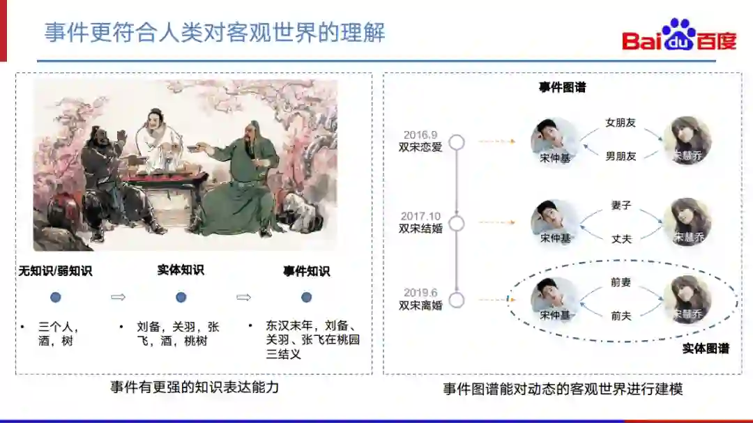 第一方面,事件其实更符合人类对客观世界的理解。例如,以桃园三结义这幅图为例。在没有知识或弱知识的时候,我们可以知道这幅图里有三个人,有酒和树。在有实体知识的时候,我们可以知道这三个人的姓名是刘备、关羽和张飞,树是桃树。直到拥有事件知识的时候,我们才可以知道具体时间在东汉末年,刘备、关羽和张飞三个人在桃园做了结义这一个事情。我们可以看到,只有到事件这个层次上,才能说真正对这幅画有一个比较完整的把握。