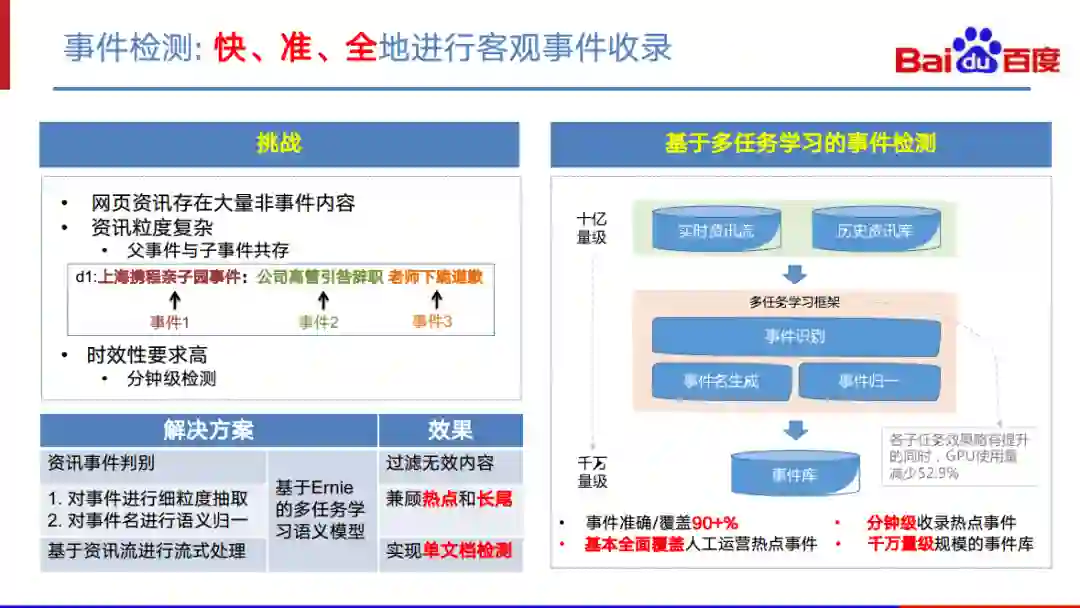 通过这个检测过程,只要一篇文档中有一部分提到了某个事件就可以进行事件收录,结合百度的高时效新闻流,上面这种流程可以实现分钟级事件收录,并且整体的准确率与覆盖率都可以到90+%。此外,由于上述流程中涉及多个策略模型,我们还尝试了多任务学习框架,上述所提及的多个策略模型在经过多任务学习后,能得到相互增强,在资源消耗降低的同时,每个模型的效果都能得到进一步的提升。
