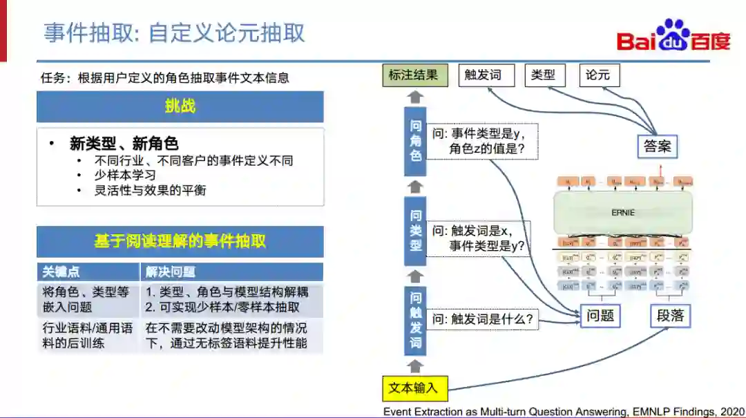 自定义论元抽取要解决的问题就是如何根据用户定义的角色少样本甚至零样本地进行事件抽取。我们的方案是基于阅读理解问答的事件抽取模型。