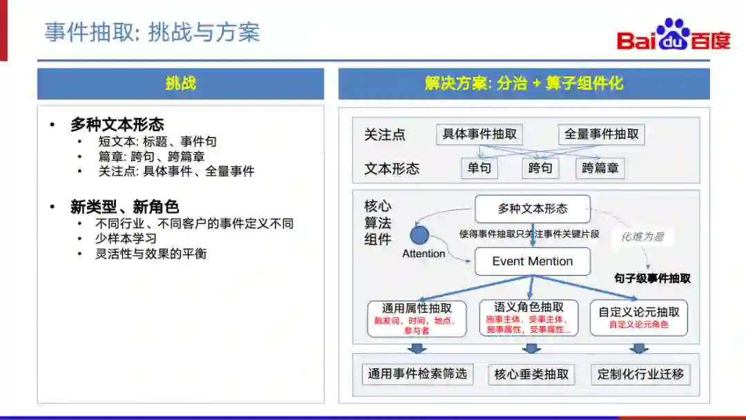 我们整体的解决方案如右图。针对不同的关注点和文本形态,我们均挖掘出核心的事件句。然后,基于这些事件句,针对不同场景使用不同的抽取技术进行抽取。目前我们已具备的抽取技术包括通用属性抽取、语义角色抽取和自定义的论元抽取。