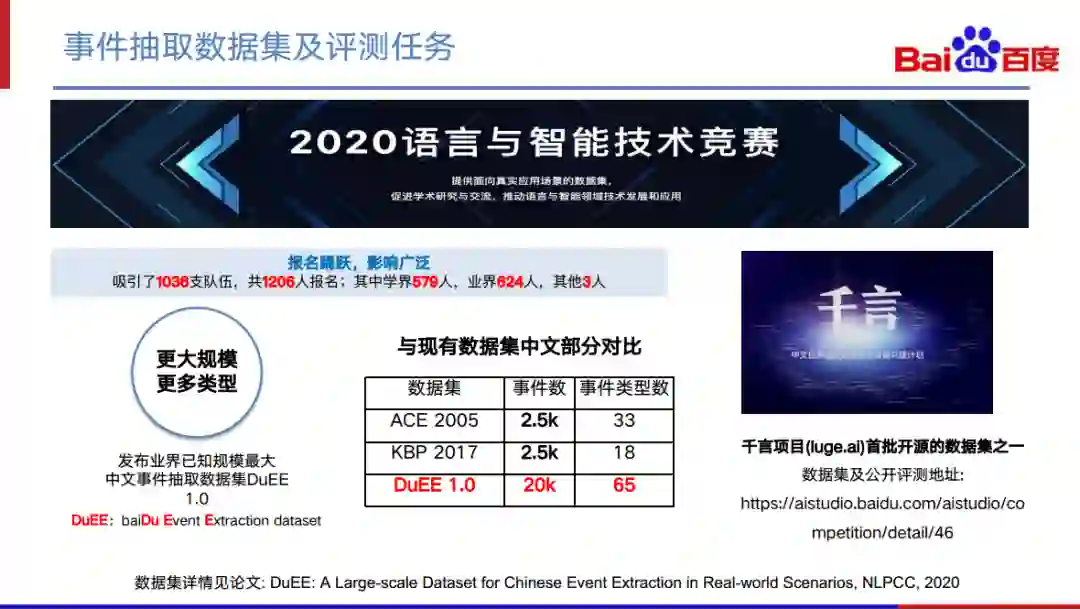 在推动学界、业界事件相关技术发展方面,我们在2020语言与智能技术竞赛中发布了目前最大的中文事件抽取数据集——DuEE,并吸引了一千多支团队报名。该数据集目前已经对外开源,在千言项目当中可以进行公开下载,同时我们也提供了一个公开的测评榜单,欢迎大家打榜参与,共同推动技术的发展。