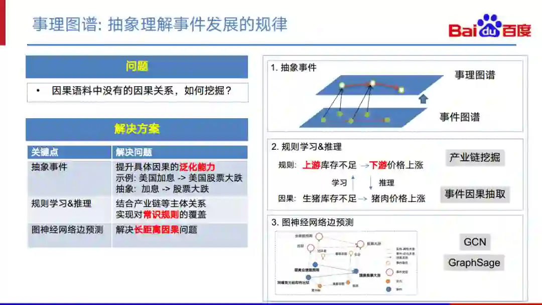 基于规则的推理。举个例子,“生猪库存不足”会导致“猪肉价格上涨”。在这里面,两个主体“生猪”和“猪肉”,其实是存在产业链关系的。“生猪”是上游,“猪肉”是下游。通过观察一系列的类似的因果,我们可以挖掘出这样一个规则:上游的库存不足,可能会导致下游的价格上涨。那么面对一种新事件的时候,比如说钢铁库存不足,我们就可以推理预测下游一些钢铁产品的价格可能会上涨。