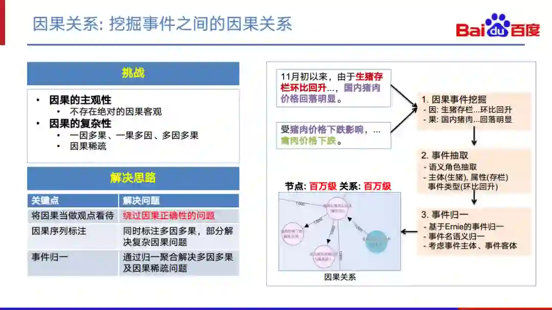 具体而言,我们的方案如右图所示。通过因果事件的挖掘,我们可以从不同的篇章当中挖掘出大量的因果关系。比如,“生猪存栏环比回升”导致了“猪肉价格明显回落”是一个因果。然后,再对这些抽取出来的因果Pair中的每个事件节点再进行归一,将不同篇章中描述的相同事件归一在一起。归一结束后,我们就可以得到一个能支持多步因果的因果图谱。我们目前已经形成一个节点正确率90+%,节点数、关系数达到百万量级的因果图谱。