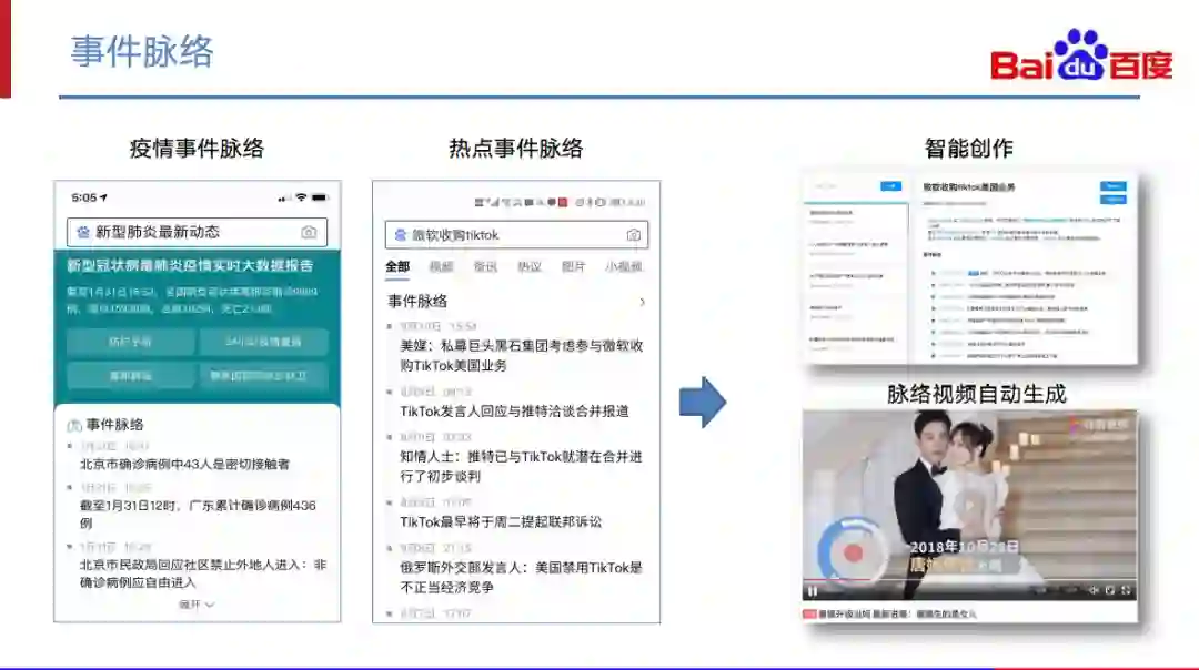 其次是事件脉络。通过事件图谱的整个事件的关联关系,我们在搜索上上线了热点事件脉络,可以将热点事件的前因后果进行关联,并以脉络的形式呈现给用户,大大提升了用户了解热点前因后果的效率。在疫情中,我们也通过事件脉络支持了疫情相关的事件脉络的查询。目前脉络相关的产品也支持了百度智能创作平台、事件脉络视频等众多应用。