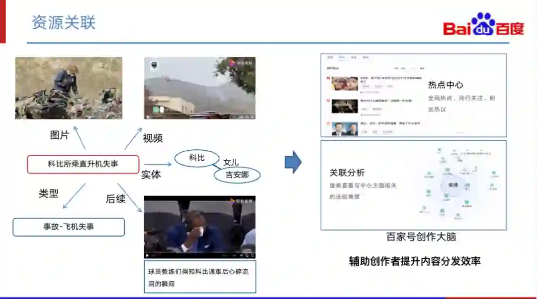 第三块是资源关联。事件图谱围绕事件将相关的资源,如资讯、图片、视频等进行关联。目前我们通过这样的技术在“百家号的创作大脑”上面进行了应用,通过事件中心资源组织,辅助作者的内容生产分发效率大幅提升。
