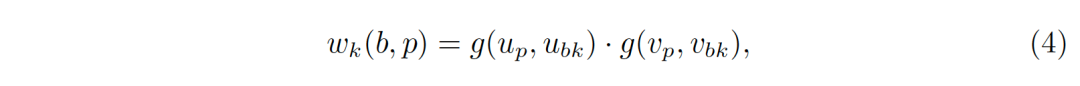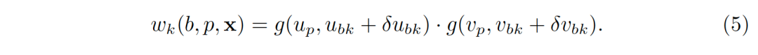 其中,g(a,b)=max(0,1-|a-b|)表示一个维度上线性插值的权重。注意公式(4)中的权重只有在采样点(u_bk,v_bk)周围最近的四个坐标才非零。