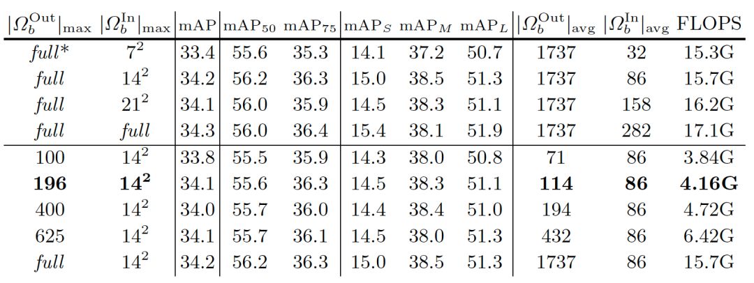 由于稀疏采样实现,计算开销可以显著降低。默认情况下,对Ω_b^In和Ω_b^Out指定最多196个采样位置。实际中,面积较大的关注区域对于Ω_b^Out将具有较少的采样位置,而面积较小的关注区域对于Ω_b^In将具有比最大采样数更少的采样位置。对于Ω_b^In和Ω_b^Out,实际的平均采样位置数分别在114和86左右,如表3所示。相应的计算开销是4.16G FLOPS,粗略地等于两个全连接层的检测头的计算量(大约3.9G FLOP)。