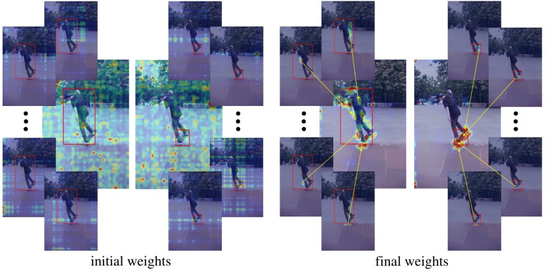下面具体看一下本文的区域特征提取算法到底学到了什么样的特征。公式(7)中的权重w_k (*)表示的是图像每个位置的特征对于最终区域特征的贡献。图2(a)显示了训练前后权重w_k (*)的变化,可以看出,训练伊始,权重w_k (*)很大程度上是随机的。在训练之后,不同部分的权重自动学习到区域的特征要关注区域上的不同位置,并主要集中在前景物体上。图2(b)分别显示了学习到的几何权重和表观权重,可以看出,几何权重主要集中在感兴趣区域,而表观权重则对应到所有前景物体上。