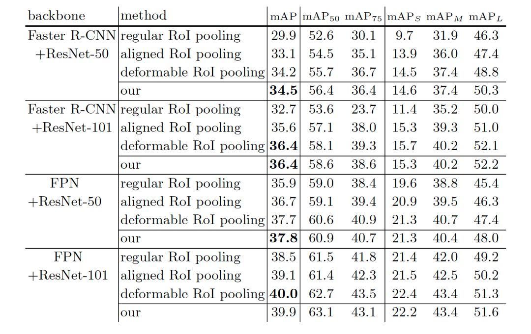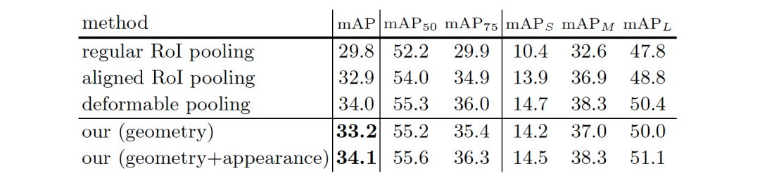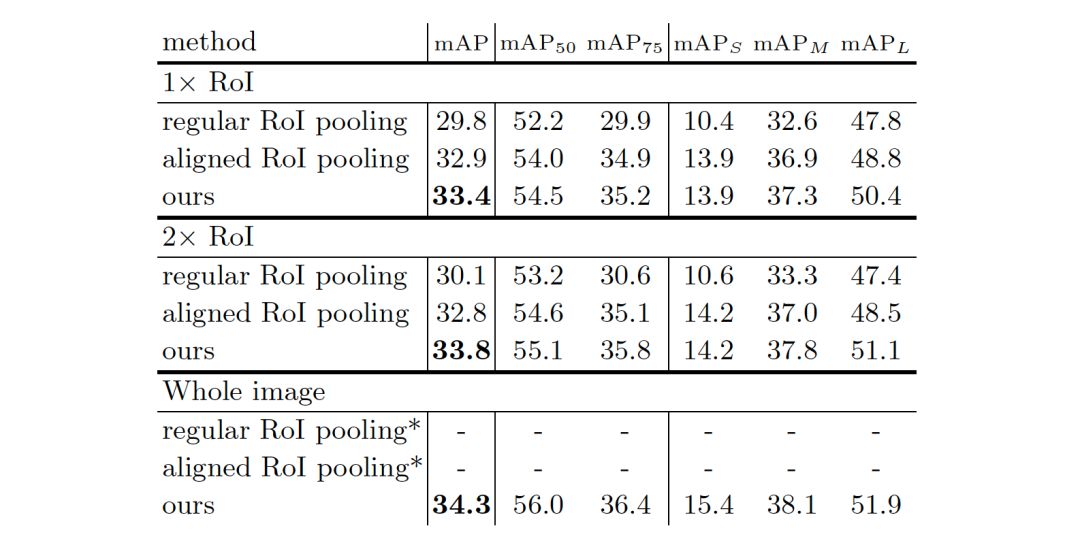 表2 不同采样区域的三种区域特征提取方法比较。在COCO验证集上报告准确性mAP。* 目前尚不清楚如何利用整个图像进行普通和对齐的目标区域池化方法,因此相应的准确数字被省略。