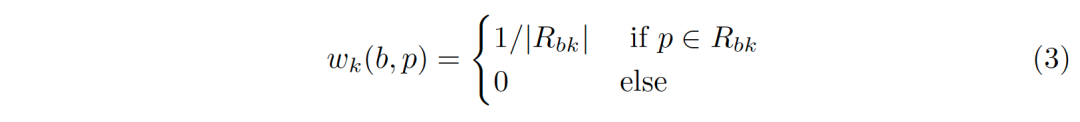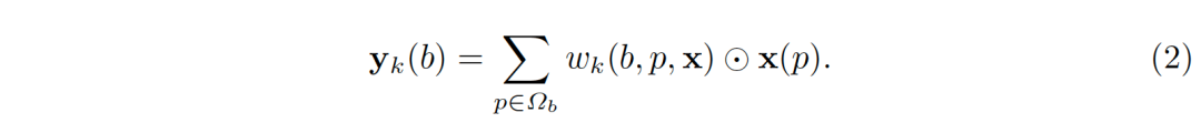 其中,Ω_b是采样区域,它可以是RoI本身,也可以包含更多语境(context)信息,甚至是全图;p枚举了Ω_b内的所有空间位置;w_k (b,p,x)是对应于位置p处的图像特征x(p)的加权权重;⊙表示逐元素乘法(element-wise multiplication),这里的权重假定是归一化的,即∑_(p∈Ω_b) w_k (b,p,x)=1。