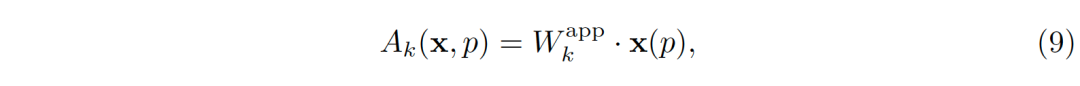 公式(7)中的第二项A_k (x,p)适应性地使用图像特征。它在图像特征上作用一层卷积,
