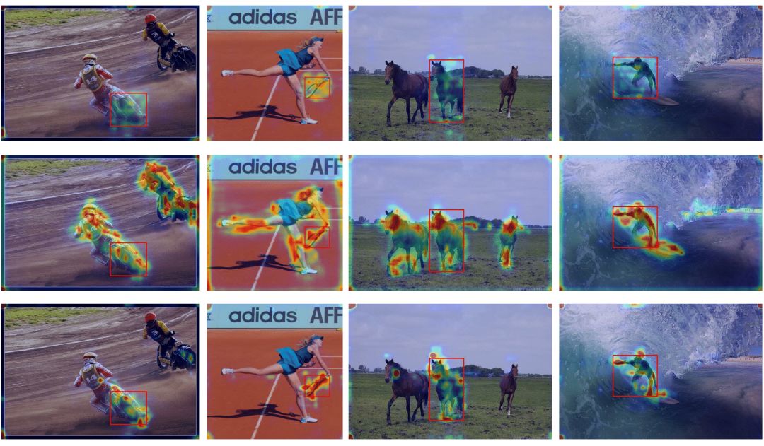 图2(b)示例:几何关系对应的权重(第一行),图像特征对应的权重(第二行)和两者结合的权重(第三行)。