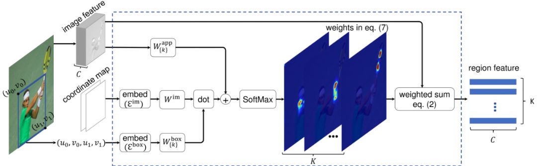 整个区域特征提取模块的结构如图1所示。在训练中,图像特征x和模块参数(W_k^box, W^im, 和W_k^app)都是同时更新的。