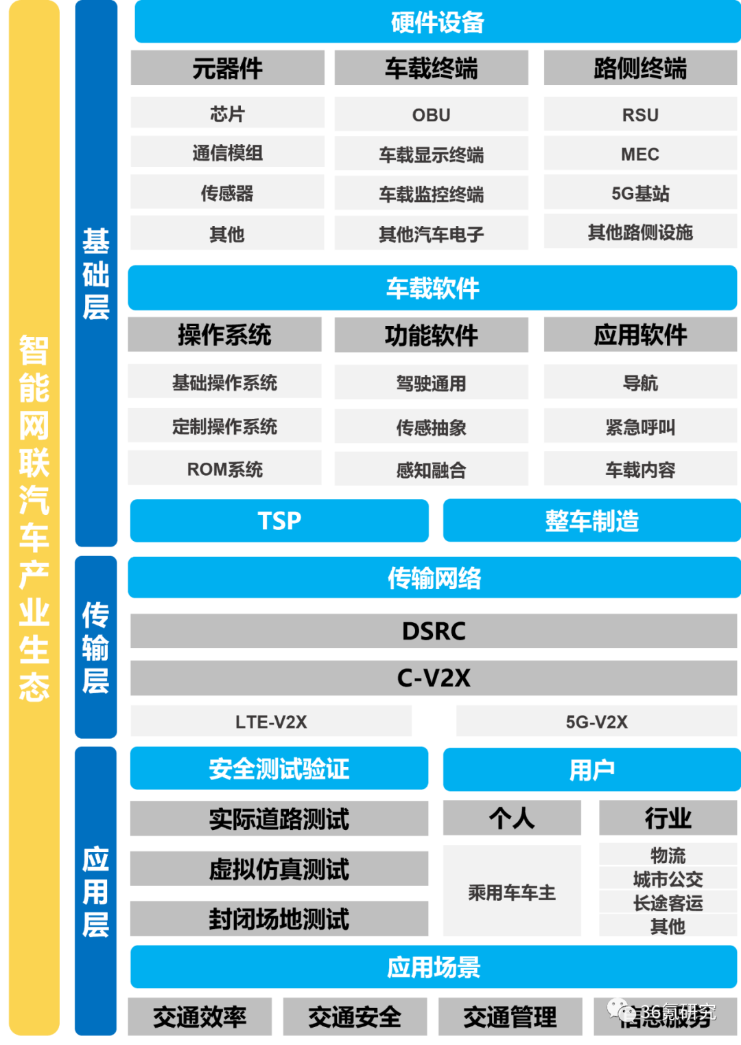 智能网联汽车产业生态可分为基础层、传输层与应用层。