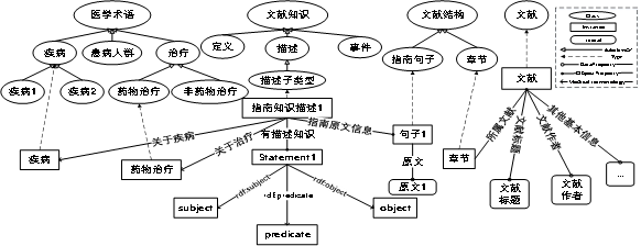 知识图谱及相关技术的出现为领域知识的结构化提供了全新手段,该技术现已经运用到医疗、教育等领域。如国际疾病分类(International Classification of diseases ,ICD)系统、统一医学语言系统(Unified Medical Language System,UMLS)等,但这些资源主要关注临床术语体系构建,未能对医学文档中除概念树以外的知识内容、知识结构及其内在关联的细粒度医学知识进行表达。