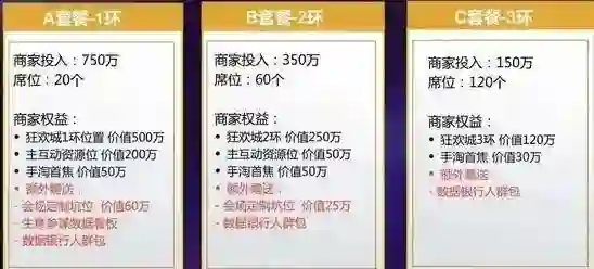 比如A套餐,只可以允许20位(手机屏幕限制不能放太多商家坑位)品牌参与,每家750w(18年数据)。这等买卖自然会大量商家参与,一位难求,限于一些原因,只可以2000家左右入围,单纯参与费就超过几亿。