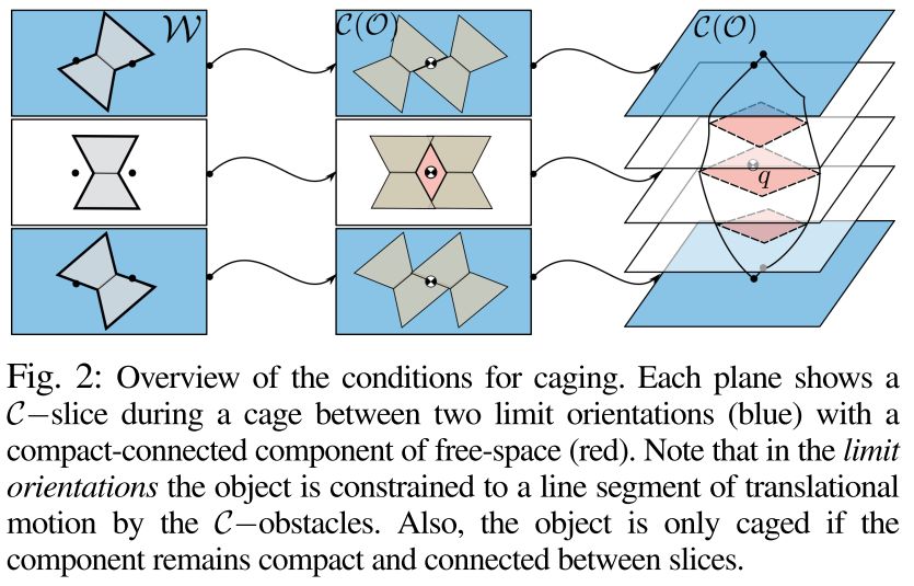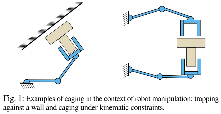 我非常喜欢的一篇文章,Caging是机器人操作里的经典问题,意思是通过几何约束把一个物体的位置限定在一个有限区域内(当这个有限区域只有一个点时,就是抓取)。