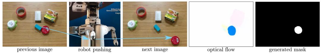 自动训练图像分割。采数据时,每次摄像头拍过照之后机器人会随机地推一下桌上的物体,根据造成的光流来自动计算mask来生成标签,就不需要人手动标定了。