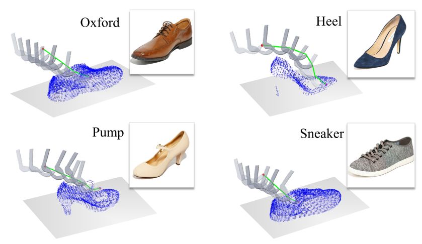 然后训练出来的策略没有任何奇怪的多余动作,9个位点看上去很靠谱,并且在抓取鞋子测试里达到90%成功率,还能泛化到没见过的鞋子款式。