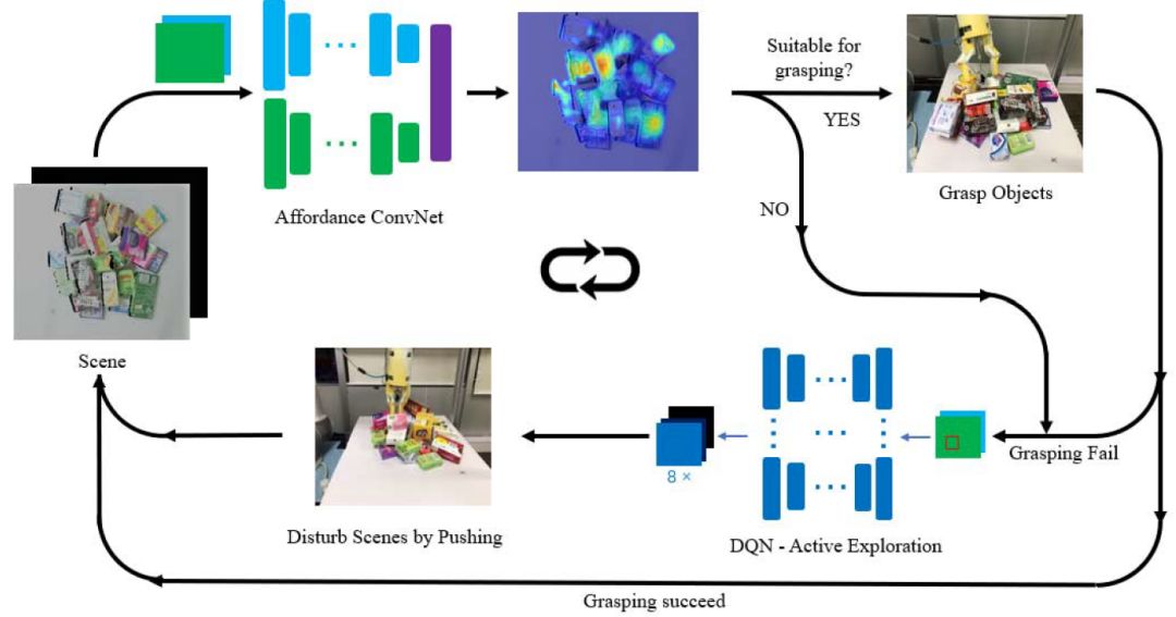 感觉是Andy Zeng的push-grasping工作的拓展,DRL使用多种motion primitive做无序抓取。这个工作除了机械手还加入了吸盘。