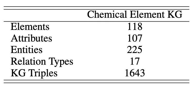 Chemical Element KG Construction: 该研究从化学元素周期表中获取所有化学元素及其基本化学性质。每个元素具有 15 个以上的性质,包括金属性、周期性、状态、重量、电负性、电子亲和力、熔点、沸点、电离、半径、硬度、模量、密度、导电、热量和丰度。提取出的三元组以 (Gas, isStateOf, Cl) 的形式存在于 KG 中,代表元素和性质之间存在指定的关系。