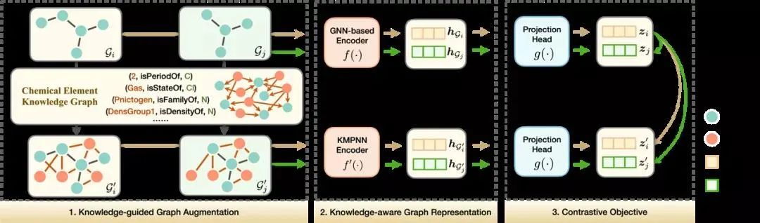 知识指导的图增强模块利用化学元素知识图谱指导原始分子图的增强过程,使分子增强图不仅包含拓扑结构知识,还包含元素的基本领域知识。
