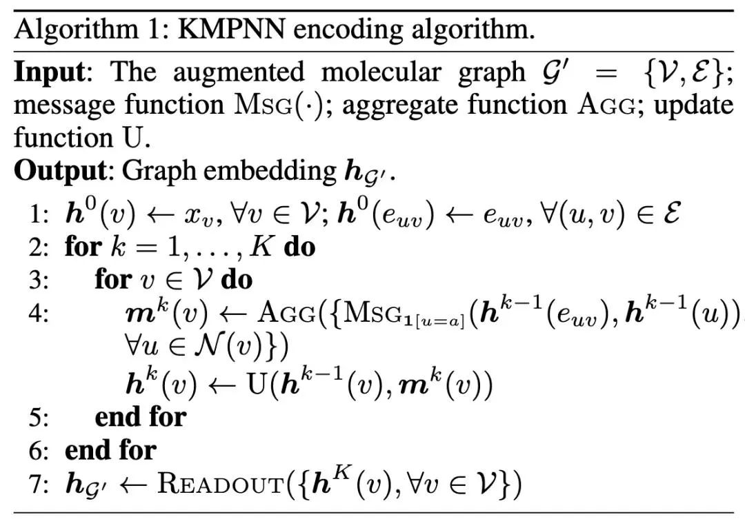 KMPNN Encoder: KMPNN 针对不同类型的邻居,提供了两种不同类型的消息传递,并根据邻居的重要性程度为其分配不同的注意力。通过 KMPNN,可获得分子增强图的表示。算法 1 描述了 KMPNN 的编码过程: