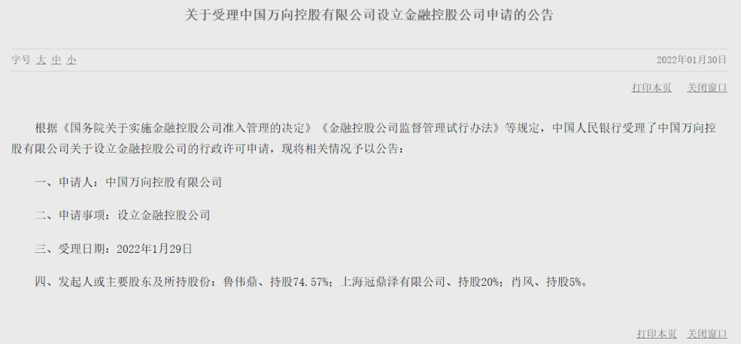 【央行受理首个民营金控牌照申请】1月30日央行官网公告,已受理深圳市招融投资控股有限公司和中国万向控股有限公司设立金融控股公司的申请。其中招融投资控股背后为央企招商局集团,而万向控股实控人为中国知名民营企业家鲁冠球之子鲁伟鼎。(中国基金报)