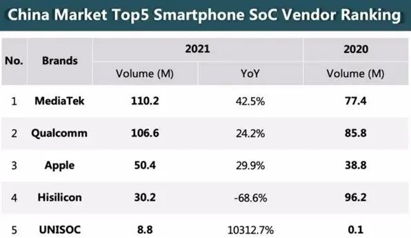 【2021年国内手机SOC销量榜:联发科登顶】近日,统计机构CINNO Research公布了201年中国智能手机市场SOC销量榜。榜单前五分别为联发科、高通、苹果、海思和紫光展锐。其中,联发科全年出货量达1.1亿颗,同比增长42.5%。海思出货3020万颗,同比下降68.6%。(快科技)