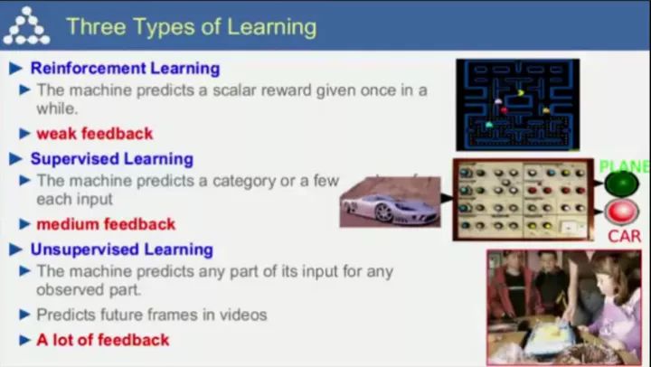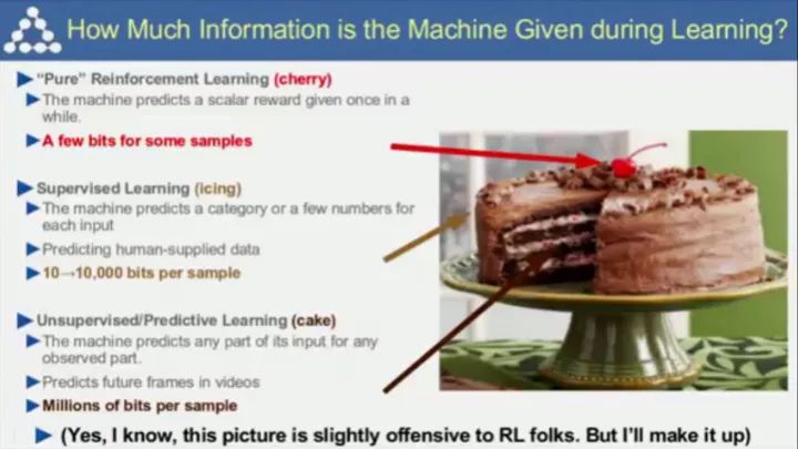 然后Lecun展示了他著名的“蛋糕”理论。“真正的”强化学习好比蛋糕上的樱桃,监督学习好比蛋糕上的糖衣,而蛋糕本身是非监督学习(预测学习)。这里Lecun也表示,这一比喻对做强化学习的兄弟可能不太友好——“Because the cherry is not optional”。