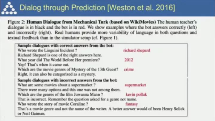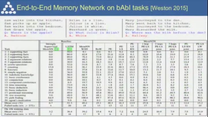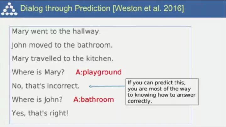 端到端的记忆网络。你之前告诉机器的东西会被储存起来,并在之后询问提及时被激活,这一方式可以用于构建对话系统,而且对话系统和机器人与世界进行交互的过程有着诸多相似之处;