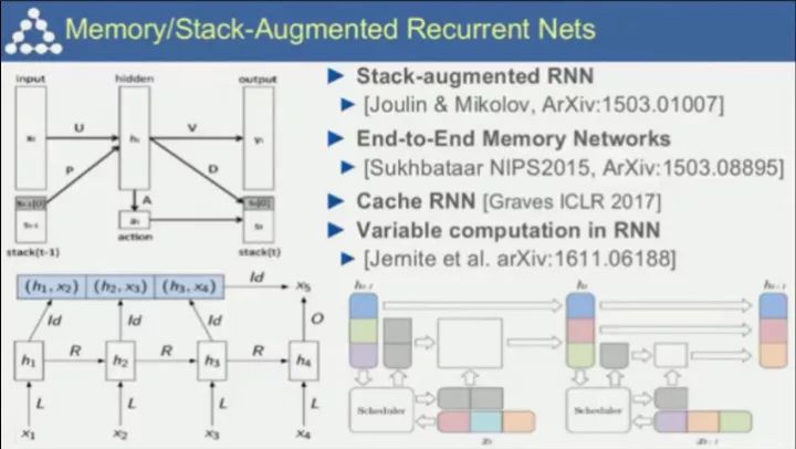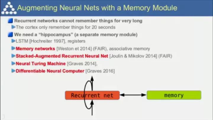 关于问答与对话系统中的预测模型。Lecun称要预测未来,你首先要记住过去,因而需要将记忆引入神经网络中,即所谓的记忆网络(Memory Network)。