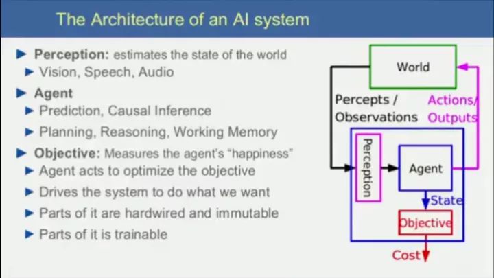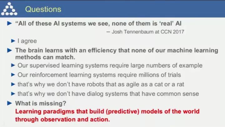 Lecun先从今年9月的CCN(Cognitive Computational Neuroscience,认知计算神经科学)大会上,MIT的认知计算专家Josh Tennenbaum的一句话说起:我们现在看到的所有AI系统都不是真正的AI。这是因为,大脑的学习效率比我们目前所有的机器学习方法效率都要高:监督学习需要大量的范例,增强学习需要上百万次试错,这也是我们的机器人无法像猫或老鼠一样灵活、以及无法造出拥有常识的对话系统的原因。