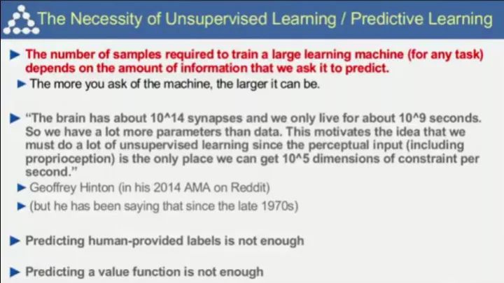 为什么下需要进一步发展非监督学习?这是由于用于训练一个大的学习机器的必要样本量取决于我们要求它能预测多少信息,你对机器要求越多,所需要的数据也越多。在人类大脑中有10^14个神经元触突,而人的一生大概有10^9秒,这意味着在人类大脑这个系统中参数远远大于数据量,而机器想要赶上人类,必须模仿人类的非监督学习方式。