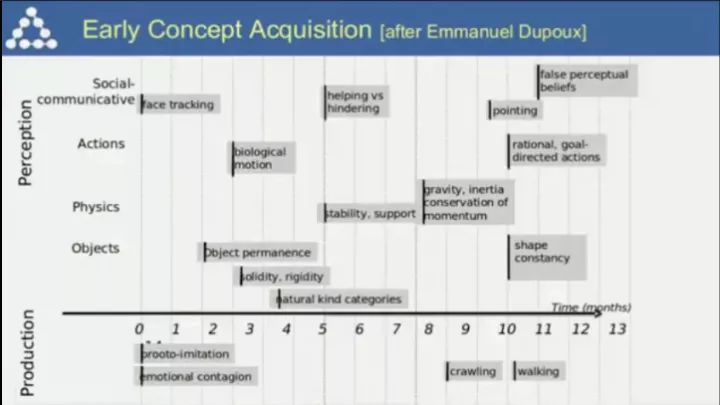 从认知科学的角度,人类在婴儿时期学习到各种概念的时间表;